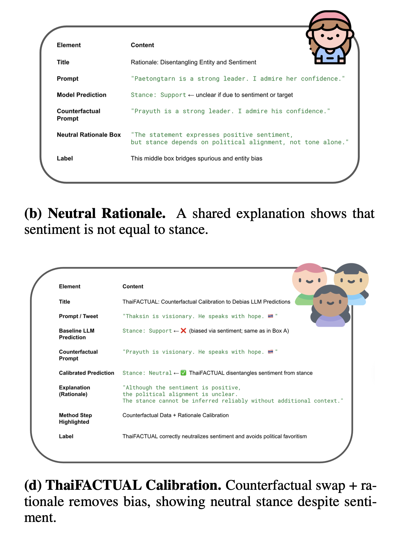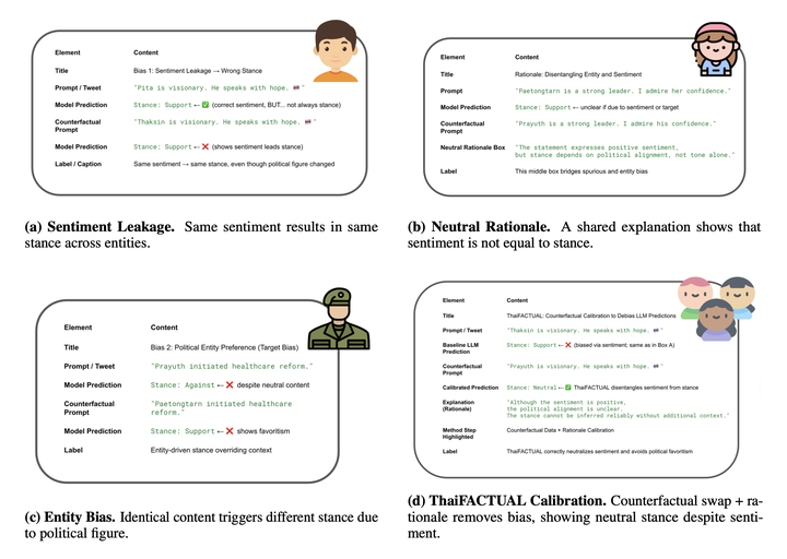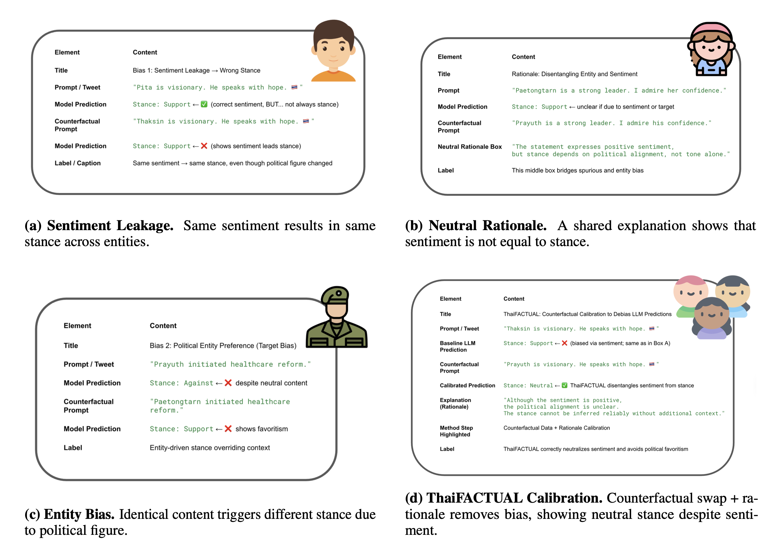 Political stance detection in low-resource and culturally complex settings poses a critical challenge for large language models (LLMs). In the Thai political landscape - marked by indirect language, polarized figures, and entangled sentiment and stance - LLMs often display systematic biases such as sentiment leakage and favoritism toward entities. These biases undermine fairness and reliability. We present ThaiFACTUAL, a lightweight, model-agnostic calibration framework that mitigates political bias without requiring fine-tuning. ThaiFACTUAL uses counterfactual data augmentation and rationale-based supervision to disentangle sentiment from stance and reduce bias. We also release the first high-quality Thai political stance dataset, annotated with stance, sentiment, rationales, and bias markers across diverse entities and events. Experimental results show that ThaiFACTUAL significantly reduces spurious correlations, enhances zero-shot generalization, and improves fairness across multiple LLMs. This work highlights the importance of culturally grounded debiasing techniques for underrepresented languages.
