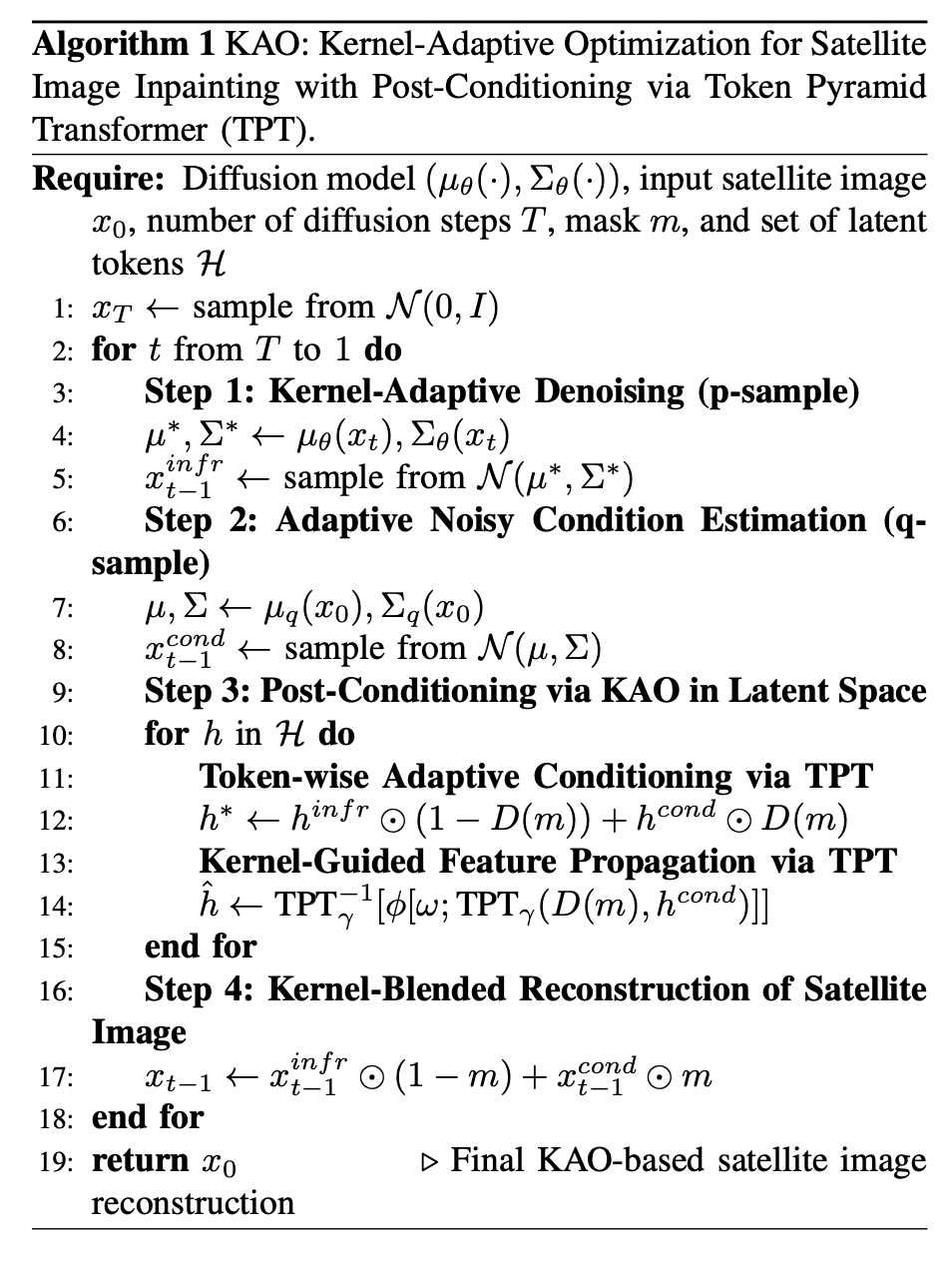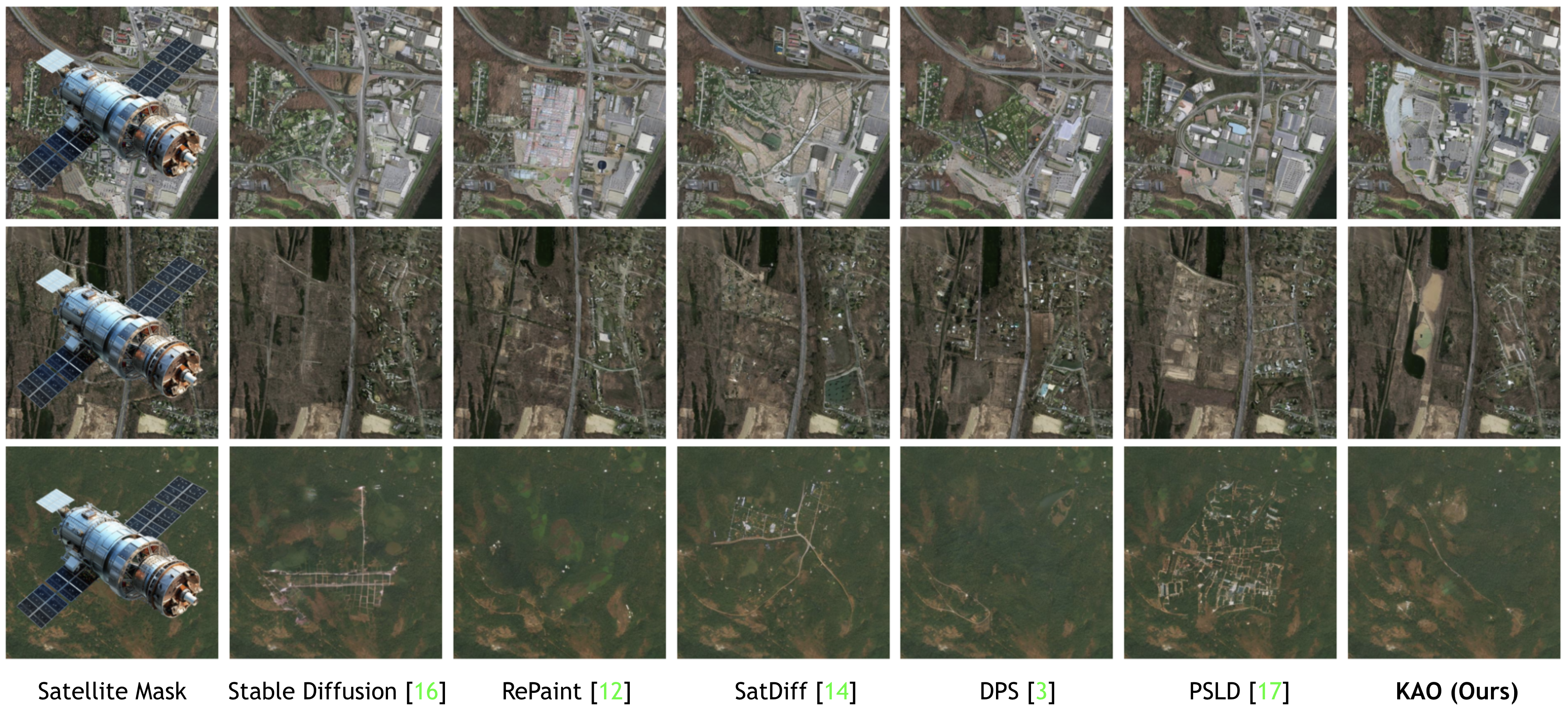 Satellite image inpainting is a crucial task in remote sensing, where accurately restoring missing or occluded regions is essential for robust image analysis. In this paper, we propose KAO, a novel framework that utilizes Kernel-Adaptive Optimization within diffusion models for satellite image inpainting. KAO is specifically designed to address the challenges posed by very high-resolution (VHR) satellite datasets, such as DeepGlobe and the Massachusetts Roads Dataset. Unlike existing methods that rely on preconditioned models requiring extensive retraining or postconditioned models with significant computational overhead, KAO introduces a Latent Space Conditioning approach, optimizing a compact latent space to achieve efficient and accurate inpainting. Furthermore, we incorporate Explicit Propagation into the diffusion process, facilitating forward-backward fusion, which improves the stability and precision of the method. Experimental results demonstrate that KAO sets a new benchmark for VHR satellite image restoration, providing a scalable, high-performance solution that balances the efficiency of preconditioned models with the flexibility of postconditioned models.